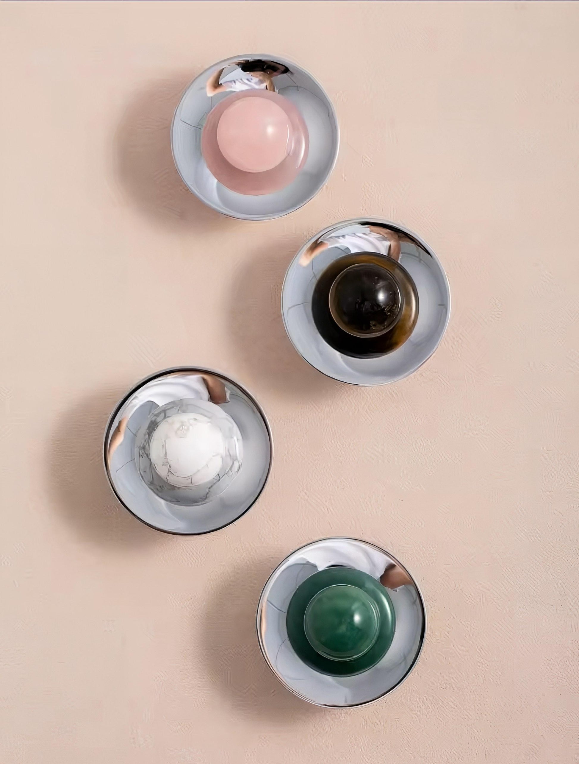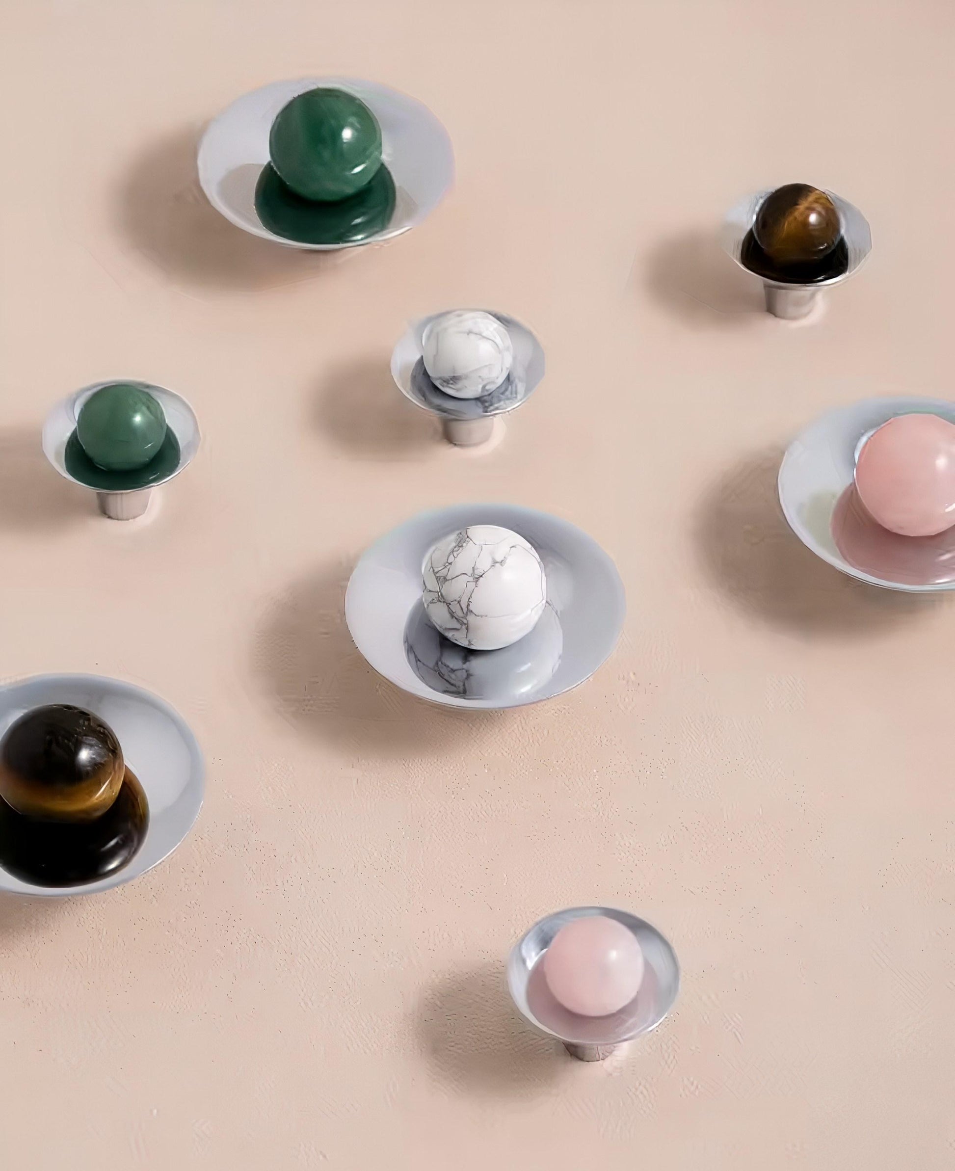 Each handle is comprised of a polished sphere of semi precious stone set onto a round brushed brass Chrome coated back plate.